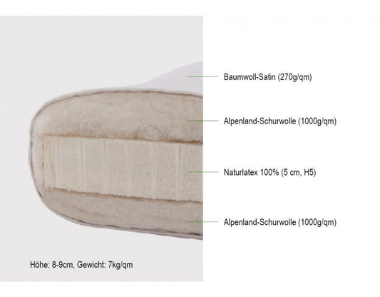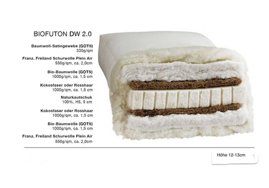 Our children's futon is made exclusively from high-quality, natural materials such as organic cotton, fleece wool, and natural latex. These materials promote a healthy sleeping environment and ensure a long mattress lifespan. Careful processing in our factory results in products that meet the highest standards.
