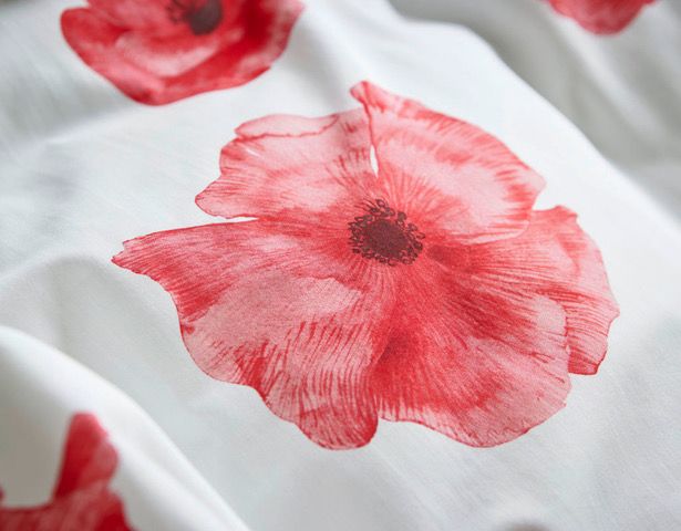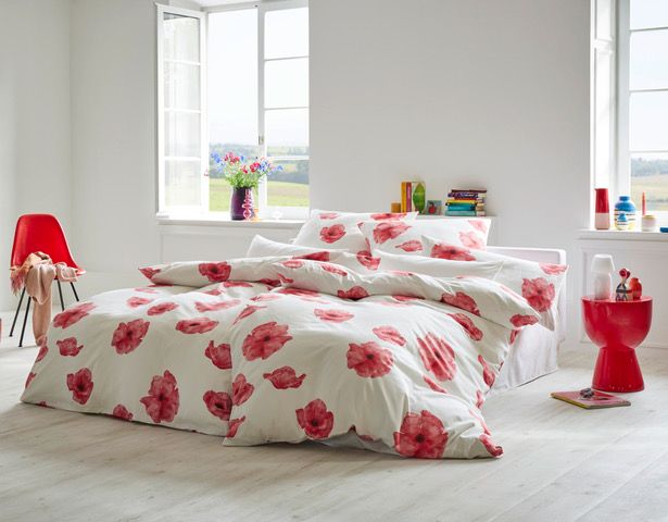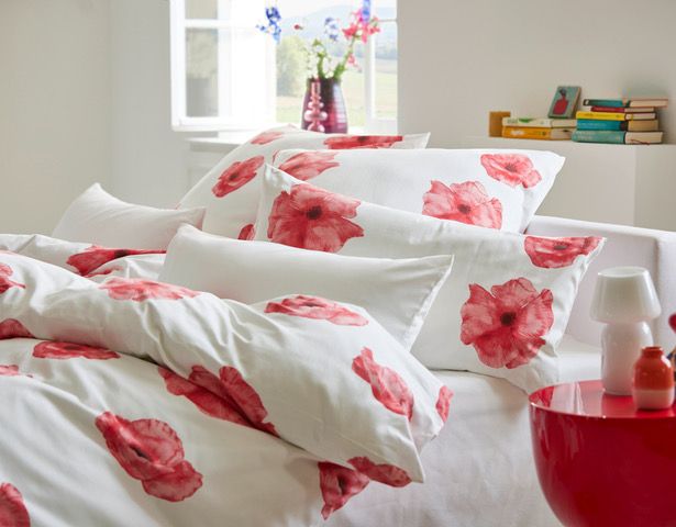 Men den fina prakten av dess blommor varar bara några dagar - det är ännu trevligare att njuta av den längre med vår nya design. De röda blommorna dekorerar graciöst den vita satängen i det ekologiska sänglinnet och ger färg till ditt sovrum. Dröm om blåsiga, pittoreska sommarängar och lyssna för att se om du kan höra kronbladens milda klapp i vinden.